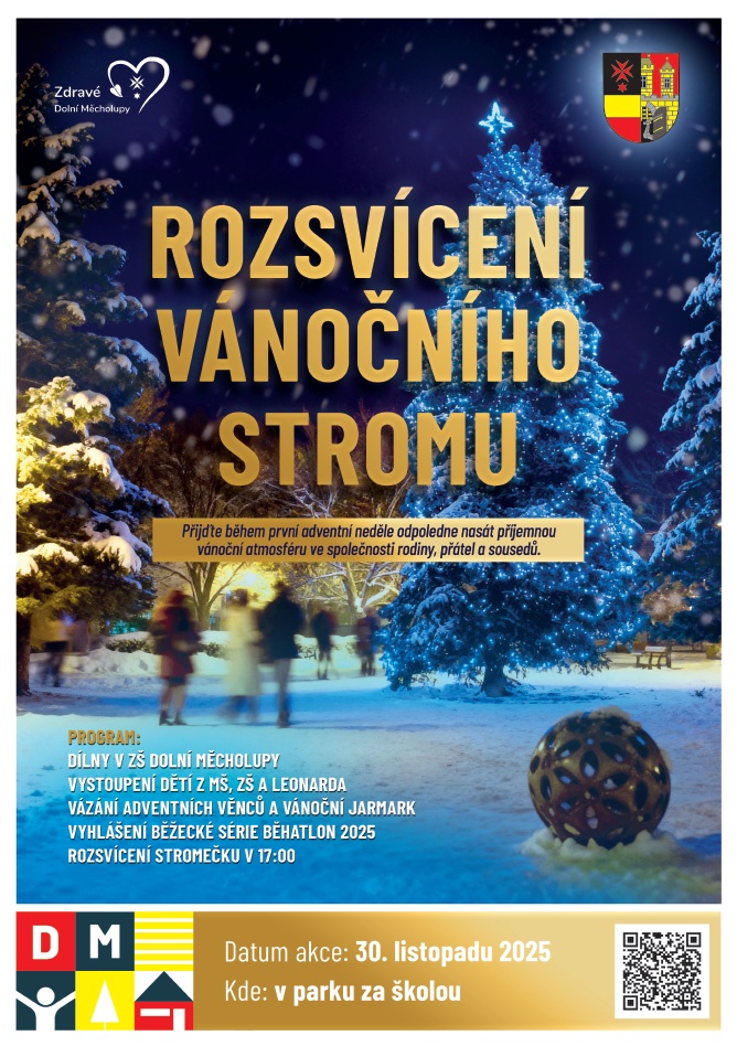 Těšit se můžete na dílny v ZŠ Dolní Měcholupy, vystoupení dětí z MŠ, ZŠ a Leonarda, vázání adventních věnců, vánoční jarmark a vyhlášení běžecké série Běhatlon 2025.